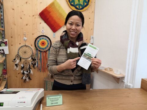 Eine weitere Sprachpatin erhält eines der bunten Lesezeichen.