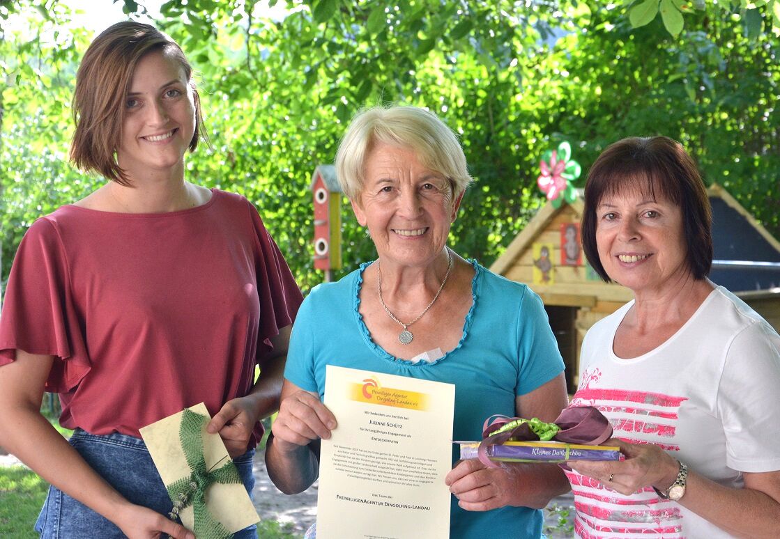 Am vergangenen Freitag bedankte sich die FreiwilligenAgentur gemeinsam mit Kindergartenleiterin Theresia Steinberger ganz herzlich bei Entdeckerpatin Juliane Schütz. Als Nachfolgerin von Altbürgermeister Reinhard Schachtner brachte sie sechs Jahre lang den Kindern spielerisch Themen aus Natur und Technik nahe. Sie war bei allen Mitarbeitern ein gern gesehener Gast, nicht zuletzt weil sie ihr Engagement mit so viel Liebe und Kreativität anging. Juliane Schütz möchte dem Kindergarten aber nicht ganz verloren gehen. So hat sie sich bereit erklärt, ihren Nachfolger gelegentlich zu unterstützen und spätestens zum Plätzchen backen möchte sie auf jeden Fall wieder zur Stelle sein.