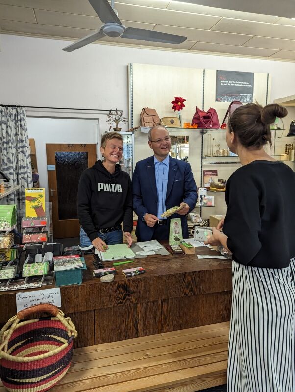 Den Anfang machte Dr. Markus Thannhuber, der die Arbeit des Teams vom Weltladen Shalom in Landau kennenlernen durfte. Er wurde begrüßt von Anetta Hummel, die im Weltladen für die Koordination und den Einkauf zuständig ist. Sie freute sich sehr über den Besuch und erklärte bereitwillig das Konzept des Vereins und stellte bei einem kurzen Rundgang die einzelnen Produktgruppen vor. Der Technik Vorstand konnte dabei viele Parallelen zu Einhell entdecken, zum Beispiel beim Thema Lieferketten und Nachhaltigkeit.