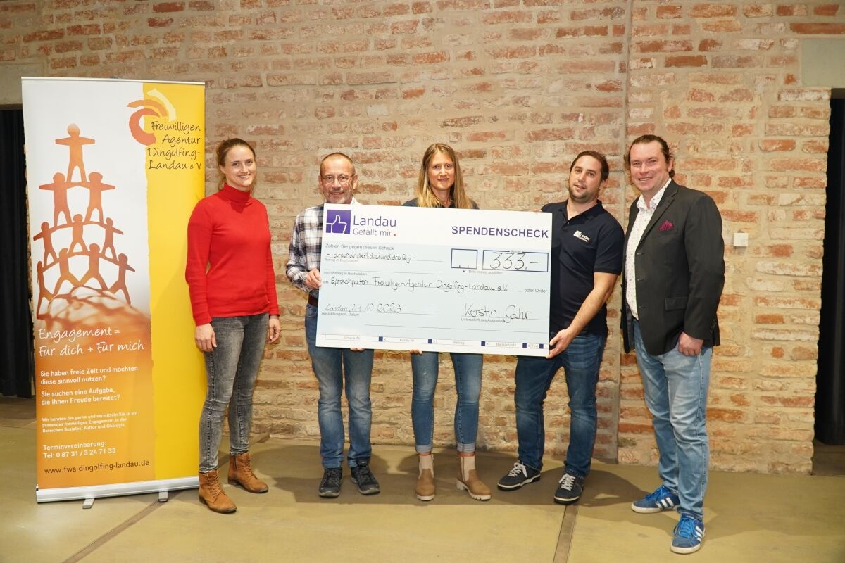 Die Sprachpaten der FreiwilligenAgentur konnten sich am Dienstag über eine kleine Zuwendung freuen. Tobias Beer, Kerstin Gahr und Daniel Jester vom Verein Landau gefällt mir überreichten Bernhard Mittermeier und Laura Dullinger von der FreiwilligenAgentur eine Spende von 333 €.
