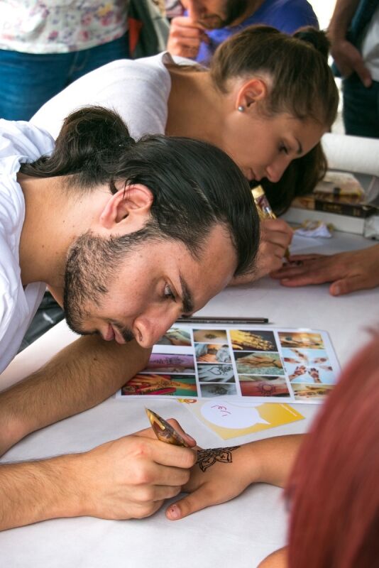 Beim Festival der Kulturen verzierte er an unserem Stand die Besucher mit phantasievollen Henna-Tattoos.