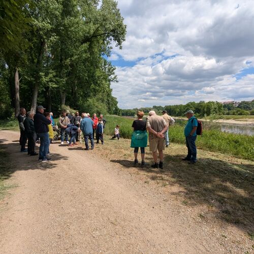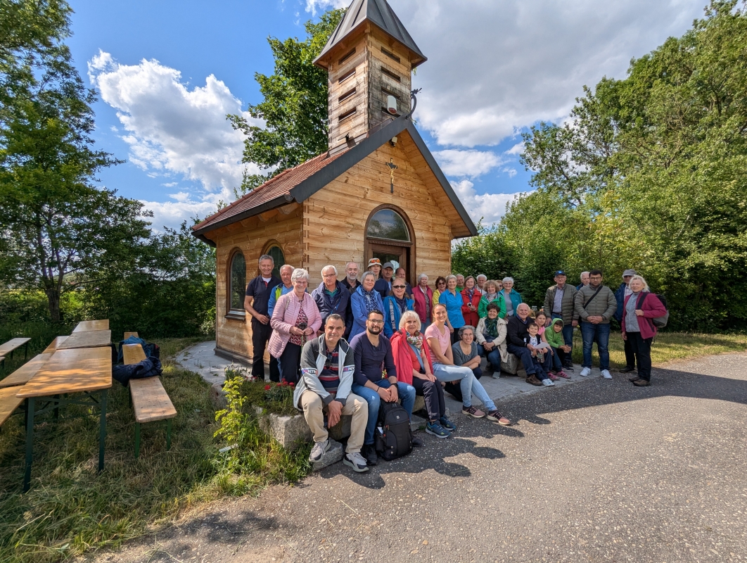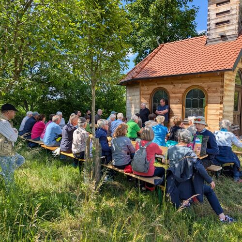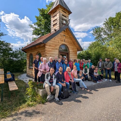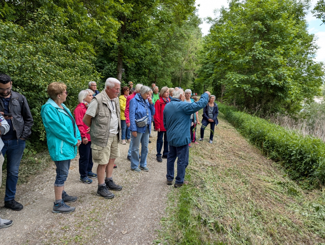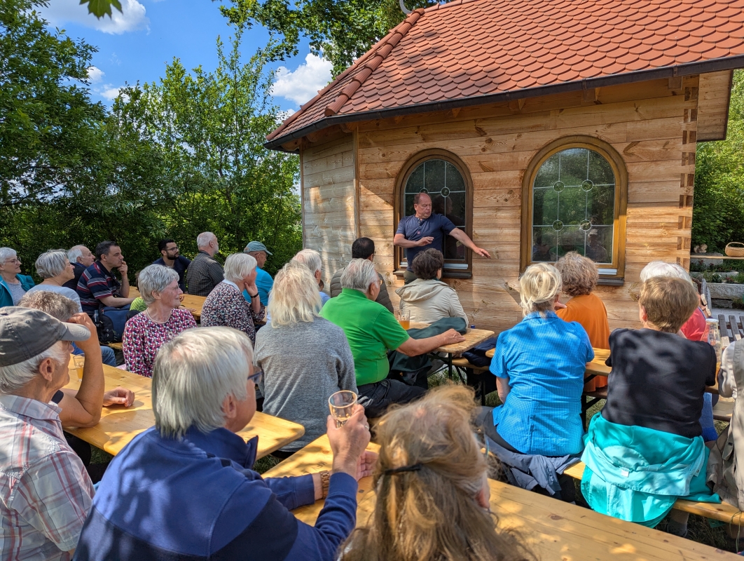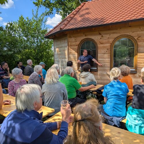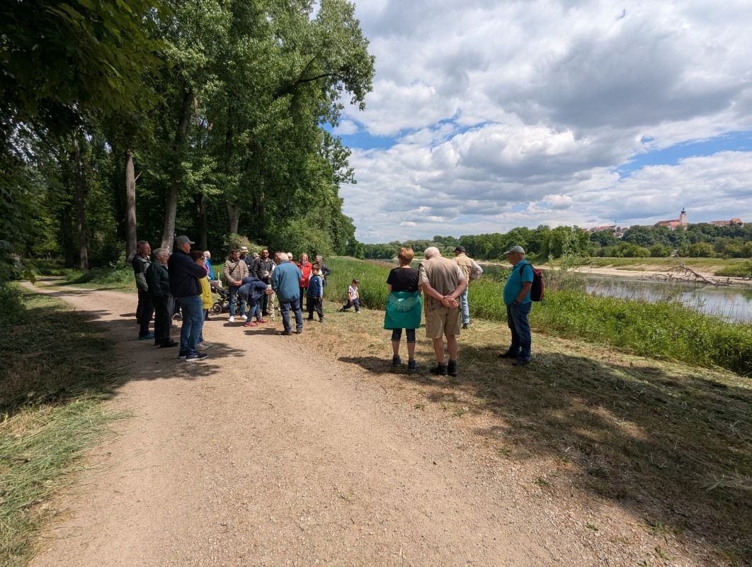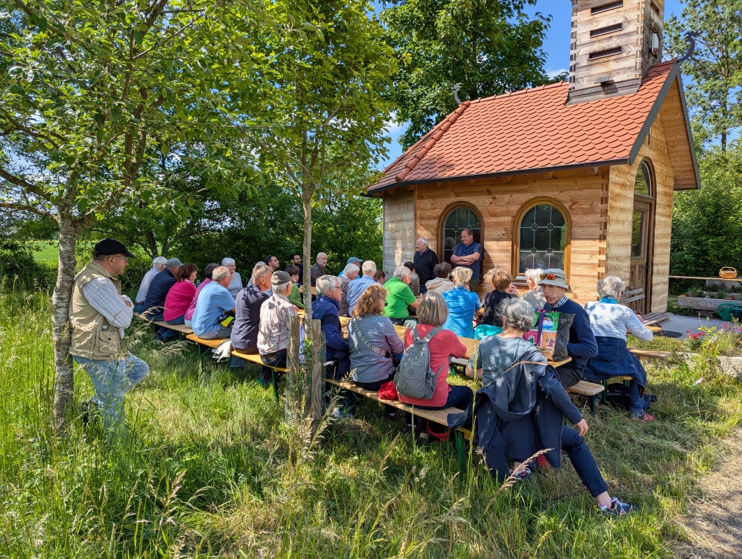 Dieses Mal führte uns Vereinsmitglied und Heimatforscher Nik Söltl vom Landauer Volksfestplatz durch die malerischen Isarauen bis zur neu errichteten Schutzengel-Kapelle am Gänsmühlbach in Harburg. Bauherr Michael Kreiner, der nach einer überstandenen Krankheit das Herzensprojekt mit vielen lokalen Handwerkern realisiert hat, begrüßte uns mit Wasser und Apfelsaft aus eigenem Anbau. Er erzählte die Geschichte hinter der Kapelle und wie sie gemeinsam mit ansässigen Handwerkern und viel Eigenleistung innerhalb von drei Monaten entstanden ist. Mit rund 35 Teilnehmern seien wir die größte Gruppe, die bisher das Bauwerk besuchte hat, freute sich Michael Kreiner und lud uns ein, im Gästebuch einen Eintrag zu hinterlassen.