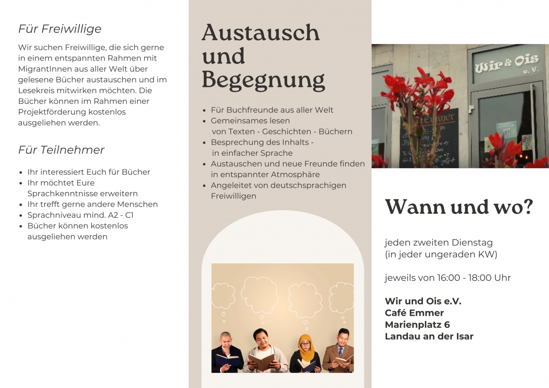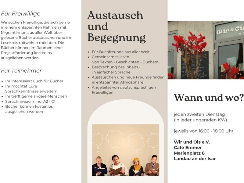 Austausch und Begegnung für Buchfreunde aus aller Welt: Gemeinsames lesen von Texten, Geschichten und Büchern mit Besprechung des Inhalts in einfacher Sprache. Erobert mit Gleichgesinnten spannende Bücher in entspannter Atmosphäre und angeleitet von deutschsprachigen Freiwilligen.